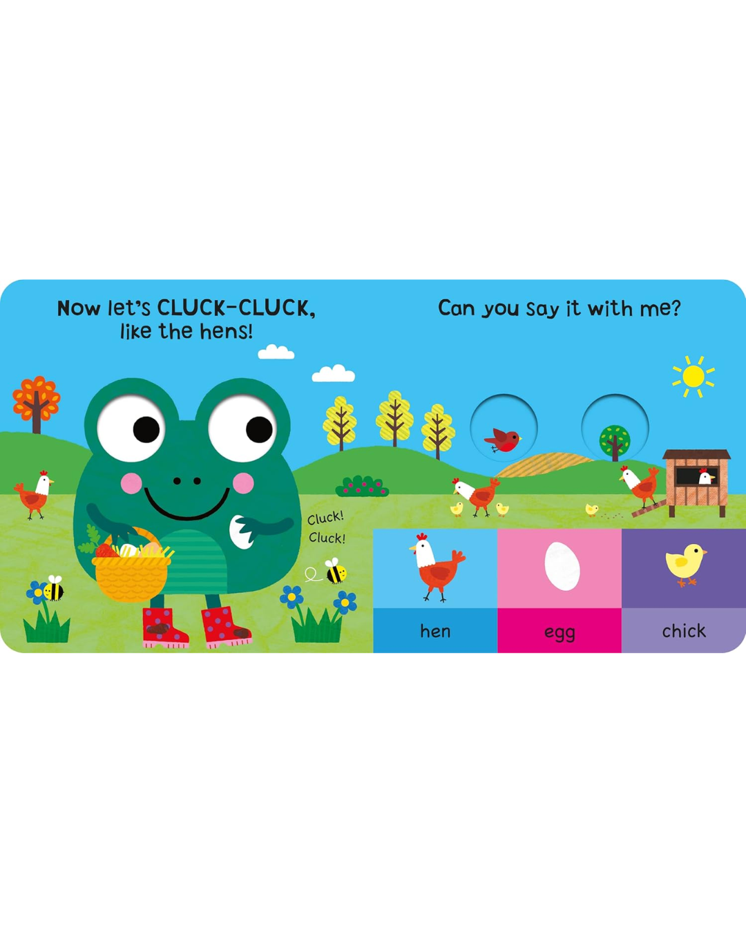 Bold, googly eyes and a sliding mechanism bring this adorable frog to life, while little children share the simple story and point at the bold pictures.