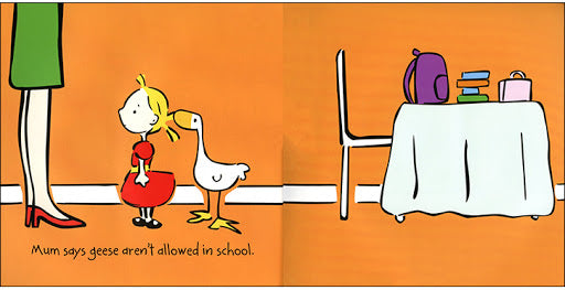 Sophie wakes up on the first day of class, set and ready to go. Not so her friend goose, whose perplexed face gives him away after Sophie’s mum says, “…geese aren’t allow in school.”