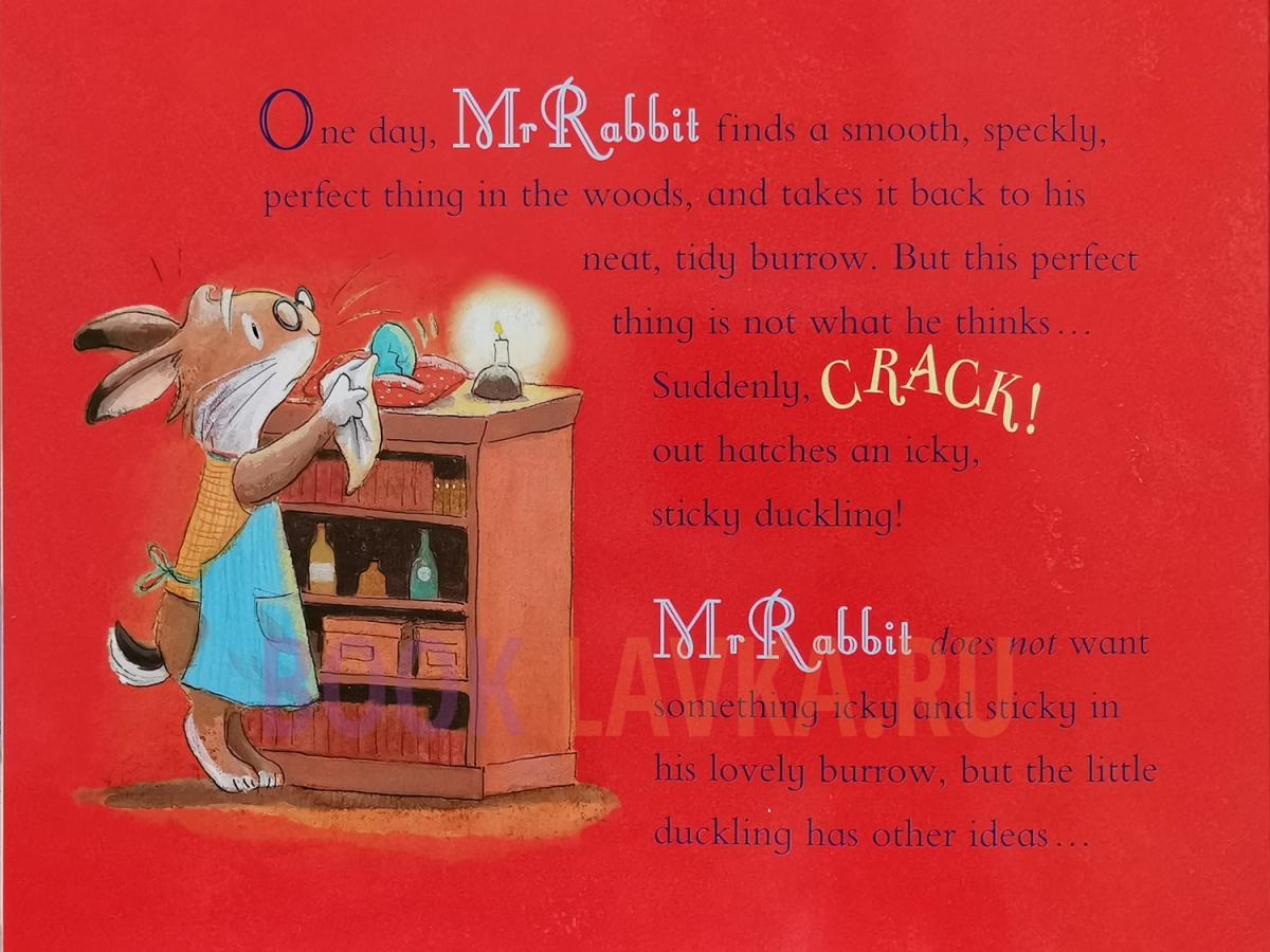 One day, Mr Rabbit finds a smooth, speckly, perfect thing in the woods, and takes it back to his neat, tidy burrow. but this perfect thing is not what he thinks... Suddenly, out hatches an icky, Sticky duckling!