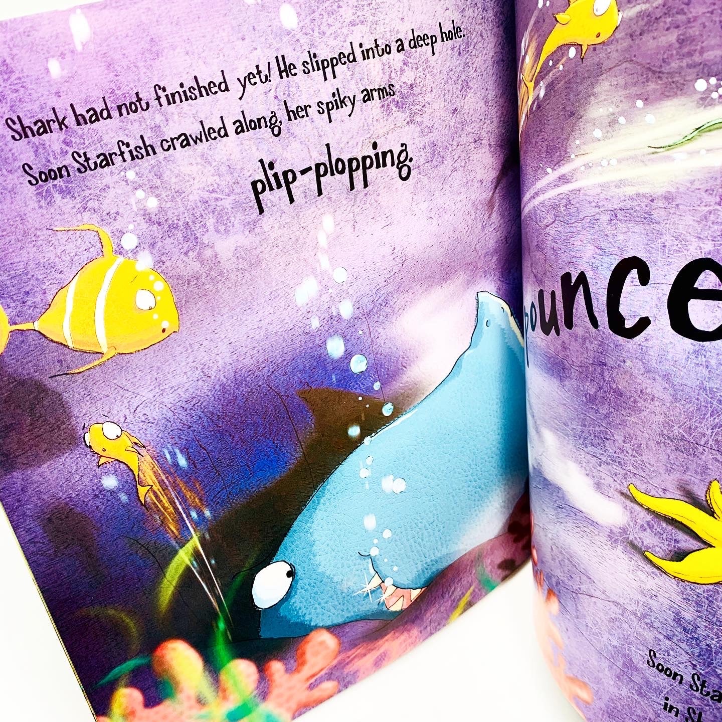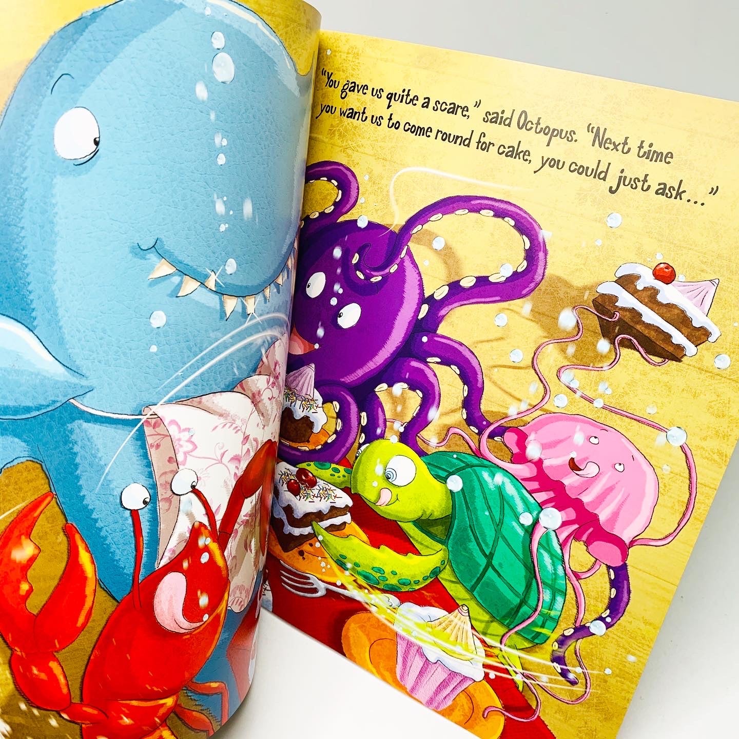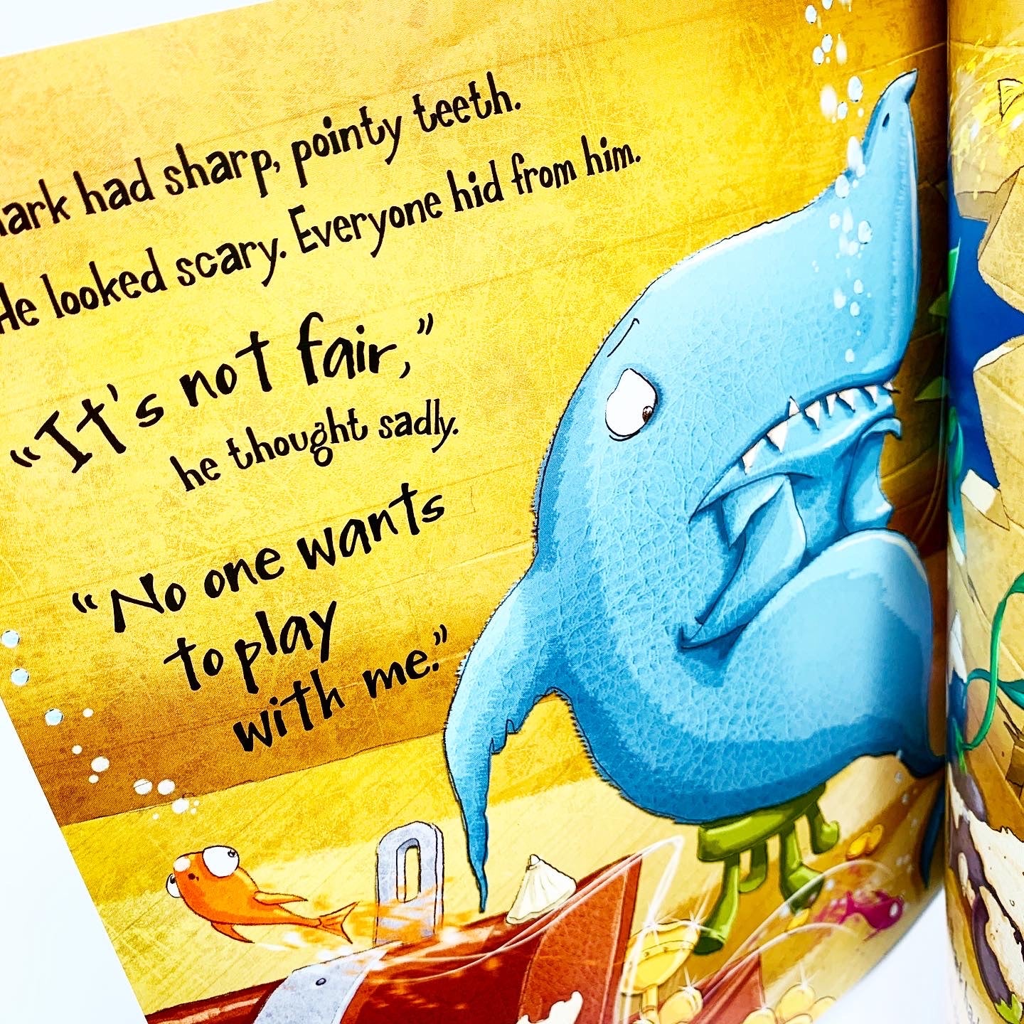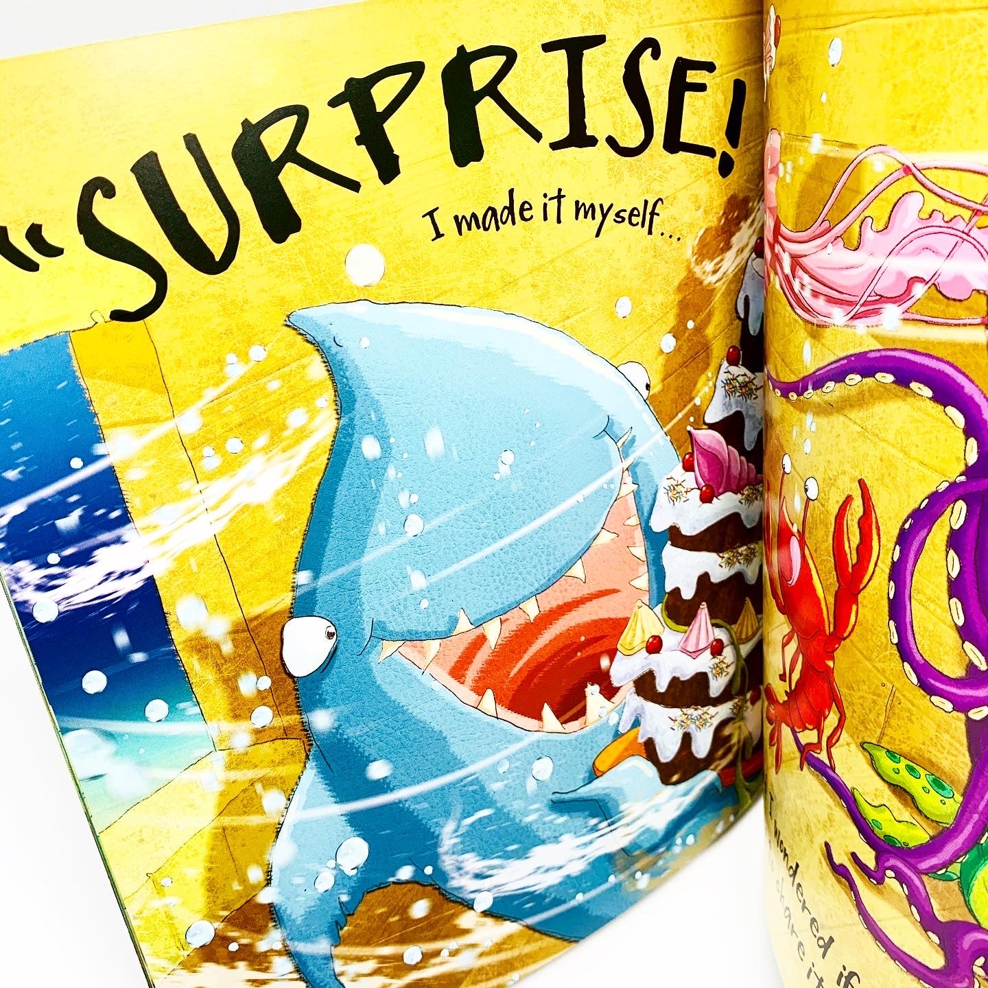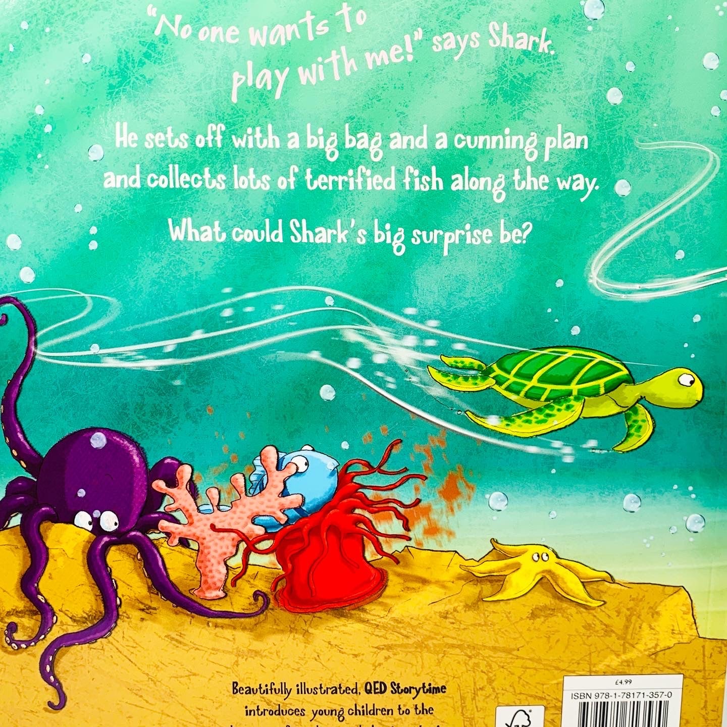 Shark only wants friends to play with and can't understand why everyone finds him so scary. Shark sets off with a big bag and a cunning plan whilst collecting lots of terrified fish along the way. What could Shark's big surprise possibly be?
